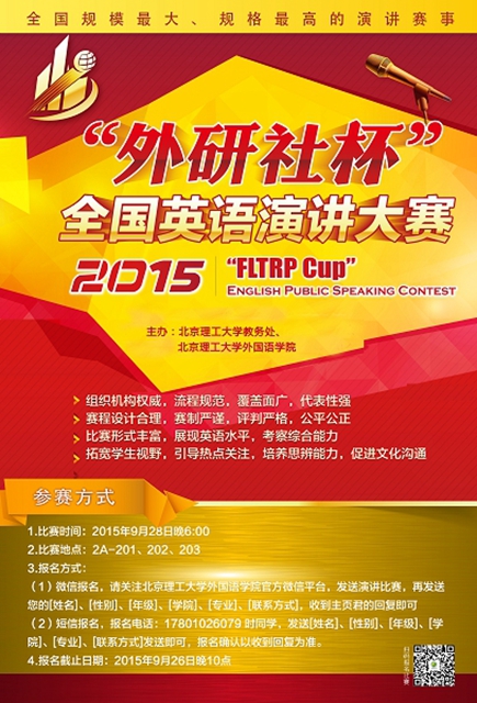 2015“外研社杯”全国英语演讲大赛北京理工大学赛区初赛报名开始了!语言是沟通世界文化的桥梁,演讲比赛的意义正是如此,旨在选拔出口语水平优秀的学生,给予广大的大学生一个展示自我的平台。现在,机会只属于你,你,不可缺少!